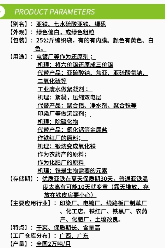 廣泛用于印染,造紙,生活污水,工業(yè)廢水的絮凝澄清與脫色,硫酸亞鐵還可用以處理含鉻廢水和含鎘廢水.等高堿度,高色度廢水處理,可以減少中和用酸的大量投入。